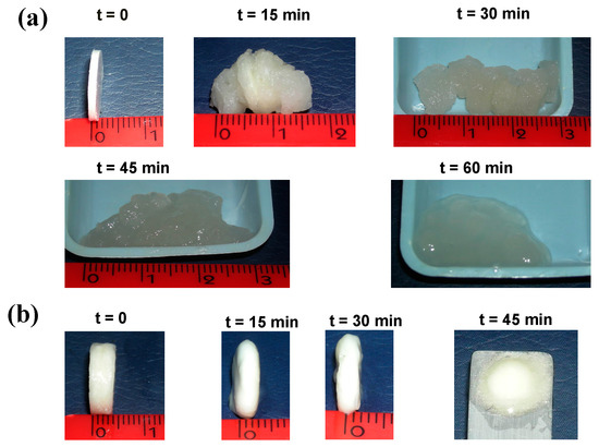 These peculiar differences observed between Sclg (from one side) and GG and LBG (from the other side) have to be ascribed to different conformations of the three polymers. Sclg is a triple helix and the effect of NaOH is revealed to be extremely rapid and dramatic in terms of chain rigidity and tablet anisotropic elongation. On the other side, GG and LBG, which are flexible chains, in the presence of borax show self-healing effects [21,22] that counterbalance, at least partially, the hydrolysis induced by NaOH. The effect of NaOH is particularly evident when the swelling data at pH 14 are compared with those obtained in distilled water (see Figure 3 in Reference [13]). Actually, the interaction of Sclg from one side and GG and LBG from the other side with borax takes place in a different way: in the case of Sclg, the borax promotes mixed (chemical and physical) interactions between the triple helices (at least for the samples prepared in distilled water) while, in the case of GG and LBG, the borax forms chemical bridges between chains by means of linkages that are reversible. During the swelling in NaOH, the labile nature of the borax cross-links in the GG, and to a lesser extent in the LBG, making the interchain interactions able to undergo the needed rearrangement in order to keep, for a while, the tendency to give the anisotropic elongation of the tablets. To better illustrate the data reported in Figure 2, the pictures of Sclg/borax tablets prepared in distilled water (a) or in NaOH (b), and swelled in NaOH (a) or in distilled water (b), for different periods of time, are shown in Figure 3.