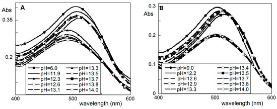 The different behaviours of the Sclg and Sclg/borax solutions as a function of pH was examined also by characterising the CR–polysaccharide interaction using UV–vis absorption and CD spectroscopy. CR is a probe widely used to follow conformational transitions in biomacromolecules, including polysaccharides [15,17,23,24,25]. Changes in the conditions surrounding the macromolecules (i.e., the interaction of the tested polymer with other molecules) can induce a well-detectable shift in the maximum of the CR absorption spectra. As reported in Figure 4, the absorption maximum of CR in solution was red-shifted in the presence of Sclg by increasing pH up to 13.1; at higher pH values, the absorption maxima decrease abruptly at almost constant values. This behaviour correlates well with the known Sclg transition, which occurs roughly at pH 13 from an ordered (triple helix) to a single-chain conformation, thus indicating that CR is a useful probe to follow this structural rearrangement. A very similar behaviour was observed with the Sclg/borax complex. However, in this case, the transition pH occurred at pH 13.5 (Figure 4) because of the stabilising effect of borax on the triple-helix structure [25].