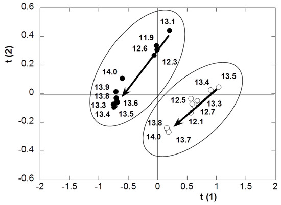 Projection of the Sclg (filled circles) and Sclg/borax (empty circles) absorption spectra onto the space spanned by the first two principal components (PCs). The arrows indicate the transition observed in the spectra at pH = 13.1 (Sclg) and pH = 13.5 (Sclg/borax).