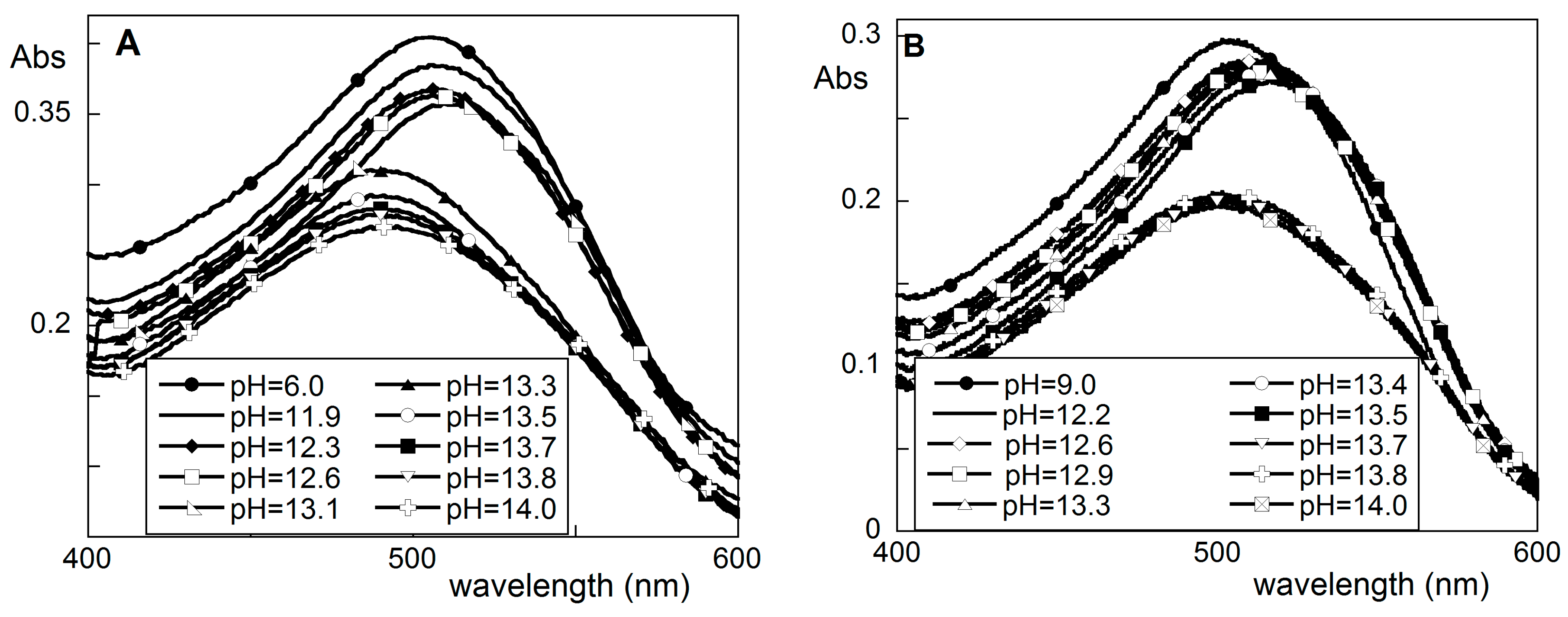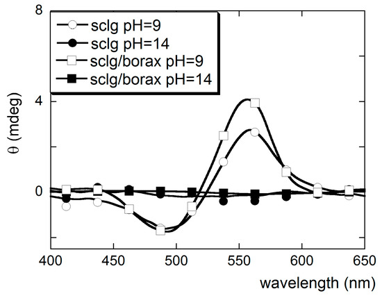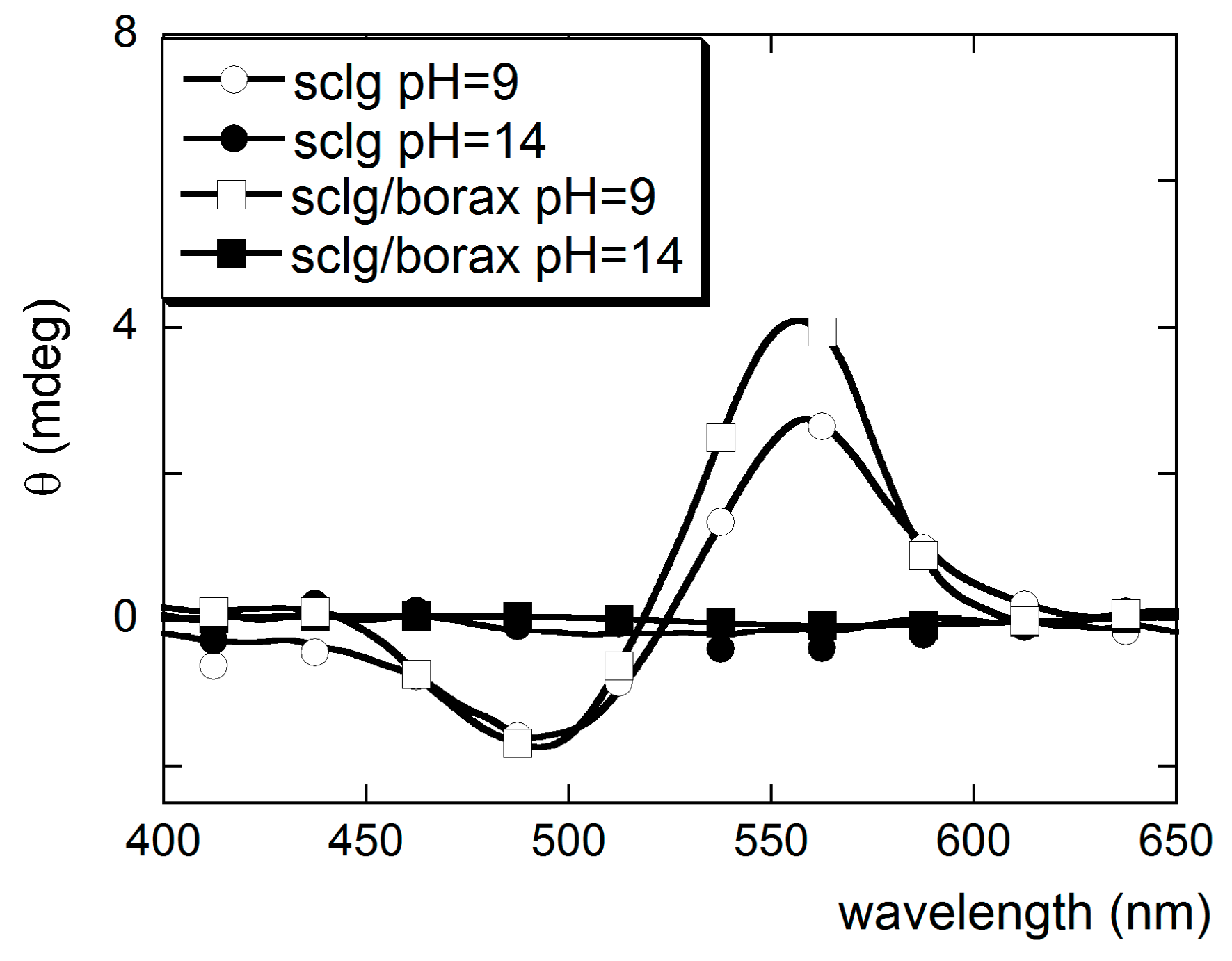 The CD spectra (Figure 6), corresponding to the absorption band of CR, were acquired at pH 9 and 14. At pH 9, a well-defined band is present in both the Sclg and Sclg/borax samples. For the Sclg/borax sample a higher induced CD signal is registered, due the presence of borax, which affects the mobility of the lateral domains of Sclg chains [8].
