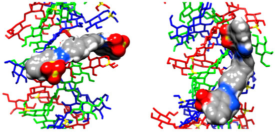 Structures of the complexes sampled during the molecular dynamics (MD) simulations of the triple helix in the presence of CR. The two structures are the more representative of the complexes with perpendicular (on the left) and parallel (on the right) orientation of CR with respect to the triple-helix axis. Sclg is reported with a stick representation, the three strands are coloured in red, blue, and green, respectively. The boron atom is evidenced in yellow. The CR molecules are reported as a surface, coloured by elements.
