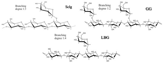Repeating units of scleroglucan (Sclg); guar gum (GG); and locust bean gum (LBG).