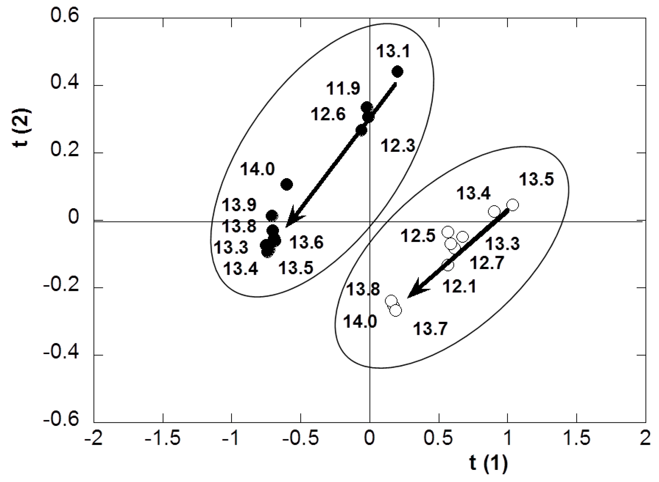 Figure 5. Projection of the Sclg (filled circles) and Sclg/borax (empty circles) absorption spectra onto the space spanned by the first two principal components (PCs). The arrows indicate the transition observed in the spectra at pH = 13.1 (Sclg) and pH = 13.5 (Sclg/borax).