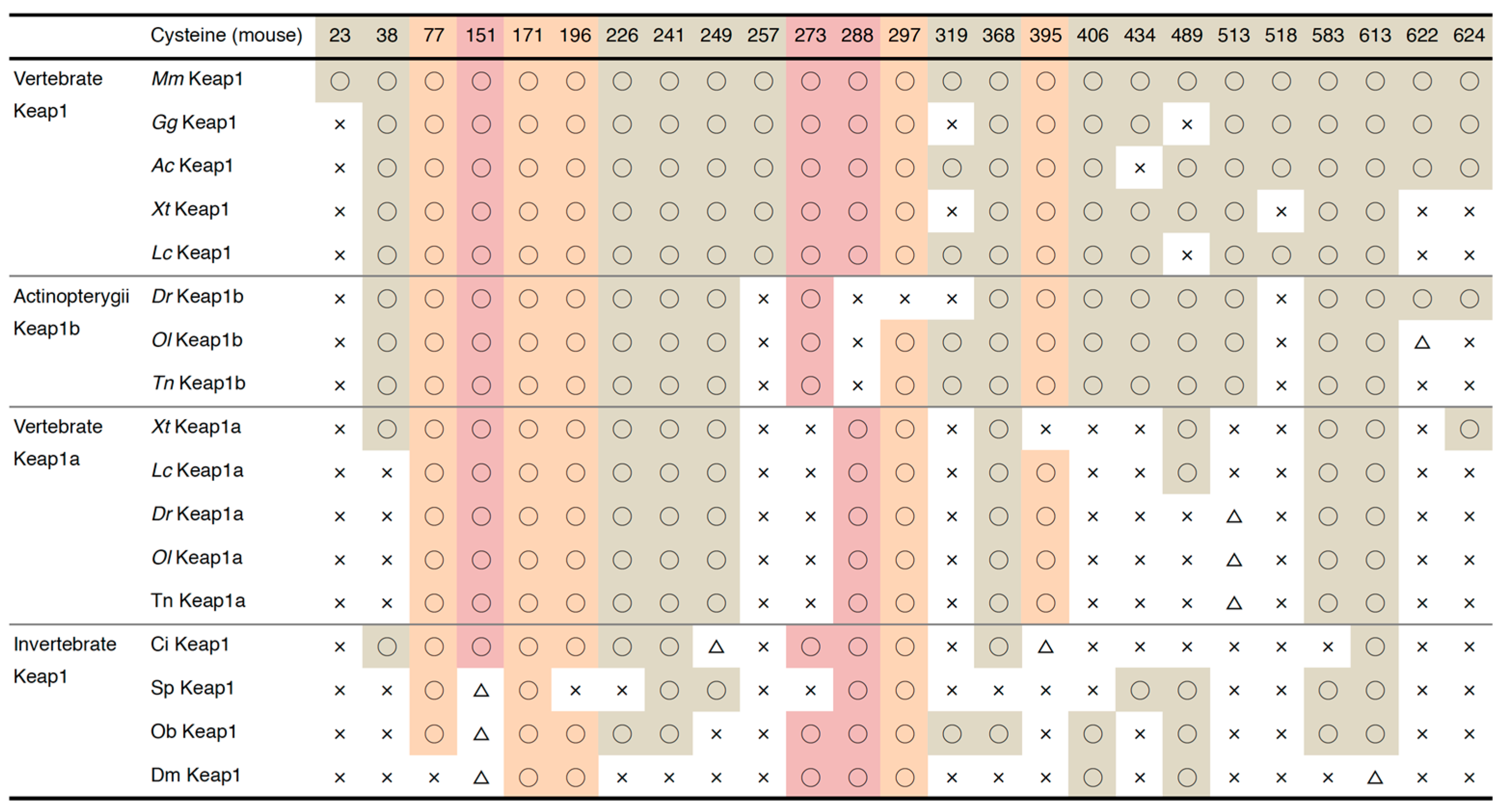 5.2. Possible Evolutionary Path of Keap1 Cysteines and Their Sensor Function