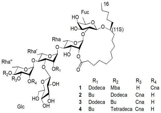 Acutacoside G–I (2–4) afforded white, amorphous powders, and gave quasi-molecular ions at m/z 1405.7697 [M + Na]+, 1405.7466 [M + Na]+ and 1433.8016 [M + Na]+ in HRTOFMS, which suggested the molecular formulas C71H114O26 (calcd for C71H114O26Na: 1405.7496), C71H114O26 (calcd. for C71H114O26Na: 1405.7496) and C73H118O26 (calcd. for C73H118O26Na:1433.7809). The IR spectrum gave absorption bands of hydroxyl groups at 3451, 3424 and, 3453 cm−1 and carbonyl groups at 1733, 1728 and 1734 cm−1. Analysis of the TCOSY, HSQC, and HMBC spectra of compounds 2–4 allowed for the complete assignment of the 1H- and 13C-NMR spectral data (Table 1). Independent alkaline hydrolysis of 2–4 afforded a mixture of organic acids and a glycosidic acid, respectively. A butyric acid group and a trans-olefinic acid group were found in 2–4; a n-dodecanoic acid was found in 2 and 3; and a n-tetradecanoic acid methyl ester (tR 18.81 min) was found in 4 by GC-MS experiments. The glycosidic acid is operculinic acid A, which was obtained from alkaline hydrolysis of 2–4. The key HMBC correlations confirmed the esterification positions of the acyl residues in the oligosaccharide core, thus a trans-cinnamoyl group was located at C-3 of Rha” in 2–4; a butyl group was located at C-2 of Rha’ in 2 and 4, and located at C-4 of Rha” in 3; a n-dodecanoyl group was located at C-4 of Rha” in 2; and a n-tetradecanoyl group was located at C-4 of Rha" in 4. The lactonization position of the aglycone was C-2 of Rha for 2–4. The structure of compound 2 was determined to be (S)-jalapinolic acid 11-O-β-d-glucopyranosyl-(1→3)-O-[3-O-trans-cinnamoyl-4-O-(S)-n-dodecanoyl-α-l-rhamnopyranosyl-(1→4)]-O-[2-O-butyryl]-α-l-rhamnopyranosyl-(1→4)-O-α-l-rhamnopyranosyl-(1→2)-O-β-d-fu-copyranoside, intramolecular 1,2”-ester; and the structure of compound 3 was suggested as (S)-jalapinolic acid 11-O-β-d-glucopyranosyl-(1→3)-O-[3-O-trans-cinn-amoyl-4-O-butyryl-α-l-rhamnopyranosyl-(1→4)]-O-[2-O-n-dodecanoyl]-α-l-rhamn-opyranos-yl-(1→4)-O-α-l-rhamnopyranosyl-(1→2)-O-β-d-fucopyranoside, intramolecular 1,2”-ester; and the structure of compound 4 was suggested as (S)-jalapinolic acid 11-O-β-d-glucopyranosyl-(1→3)-O-[3-O-trans-cinnamoyl-4-O-n-tetradecanoyl-α-l-rhamnopyranosyl-(1→4)]-O-[2-O-butyryl]-α-l-rhamnopyranosyl-(1→4)-O-α-l-rhamnopyranosyl-(1→2)-O-β-d-fucopyranoside, intramolecular 1,2”-ester (Figure 1).