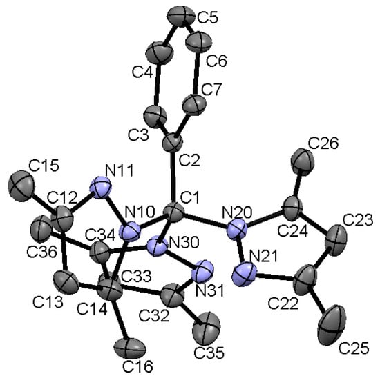 Suitable crystals of compound 1b were obtained from a saturated solution in AcOEt. Crystals of 1b crystallize in the orthorhombic system in the acentric P212121 space group. The molecular structure is displayed in Figure 3. Bond distances and angles are very similar to those found in compound 1a (average values): N-C-N bond angle of 110(2)°, N-C-CPh angle of 111(2)° and C-N and C-CPh bond distances of 1.476(16) Å and 1.525(5) Å, respectively. Three blades are formed by Pz rings; the values of the R3-C-N-N torsion angles are ±87.17(4)° (sc), ±104.2(4)° (ac) and ±166.6(4)° (ap).