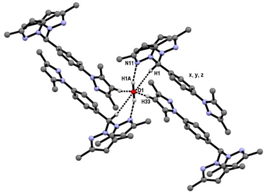 Two molecules of 2 are hydrogen bonded to one molecule of water. One of them forms a pseudo six membered ring R22(6) [51] through strong O-H∙∙∙N interactions, with the participation of pyrazole N atom as the acceptor and by soft C(sp3)-H∙∙∙O interactions. The other molecule of 2 is linked to the oxygen atom of the water molecule by pyrazole C4-H as donor (Figure 5). This supramolecular arrangement highlights the acid-base sites in the molecule, in agreement with the proposed mechanism of transformation of compound 2 into compounds 3 and 4 (vide supra).
