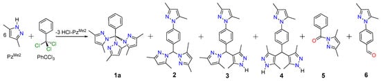 Since the reaction of pyrazoles with PhCCl3 has been reported to occur in low yields [32], we decided to explore the heating of 3,5-dimethylpyrazole (PzMe2) without solvent while varying several different reaction conditions such as temperature, time, stoichiometry and the reaction atmosphere. Results are listed in Table 1 by numbered entries as yields of the isolated products after column chromatography. Initially, the reaction was performed in an open flask equipped with a condenser, the PzMe2 to PhCCl3 ratio was chosen as 6:1, the excess of PzMe2 was used to trap the evolved HCl, the mixture was melted (100 °C) and stirred for 10 h. A stronger base than PzMe2 was not used to trap the evolved HCl in order to prevent the production of 1,1,2,2-tetrachloro-1,2-diphenylethane as side-product [33]. In the above conditions, compounds 2, 5 and 6 were isolated in low yields from the reaction mixture (entry 1) and sublimated PzMe2 was observed on the top of the flask (Scheme 1).