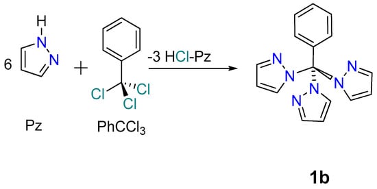 In an effort to contribute to the design of a new and improved synthesis of poly(pyrazol-1-yl)methane ligands, we decided to explore the synthesis without solvent (solventless synthesis) of tris(3,5-dimethylpyrazol-1-yl)phenylmethane (1a) and tris(pyrazol-1-yl) phenylmethane (1b), starting from α,α′,α″-trichlorotoluene (PhCCl3) and 3,5-dimethylpyrazole (PzMe2) or pyrazole (Pz), (Figure 1). In this sense, thermal treatment [27] as well as sonochemical methods [28], mechanochemistry [29], microwave [30] and infrared [31] irradiation have been used for chemical synthesis driven by the search for new and cleaner synthetic methodologies. To the best of our knowledge, the sterically crowded compounds 1a and 1b have never been described before, whereas PhCCl3 has been scarcely used in spite of its similarity to CHCl3. It has been reported as the starting material for the synthesis of the hexadentate N6-donor phenyltris[3-(2-pyridyl)pyrazol-1-yl]methane [32].
