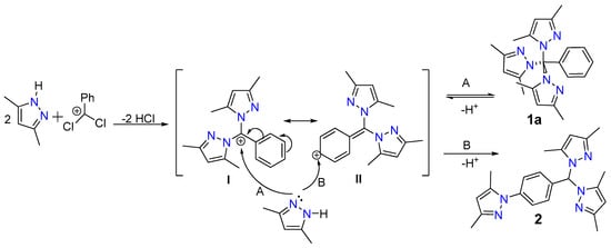 Based on the above results a mechanistic pathway is proposed for the heating reaction of PzMe2 and PhCCl3. A nucleophilic attack of two PzMe2 molecules to carbocation PhCCl2+ formed from PhCCl3, give the intermediate carbocation I. The fate of carbocation I depends on temperature, at 80 °C, the attack of the third PzMe2 leads to compound 1a (Scheme 3, path A). Compound 1a reversibly releases one pyrazole ring to regenerate carbocation I when temperature is increased to 100 °C. Then, compound 2 is obtained by the attack of the third PzMe2 to the resonance quinonoid aryl carbocation intermediate II (Scheme 3, path B) loosing of one proton to recover the aromatic form. The intrinsic instability of compound 1a could be attributed to the steric repulsion exerted by both phenyl and methyl groups, which favors the breaking of the bridge C-N bond to liberate the steric constraint. α-chlorobenzyl cations have been reported as intermediates in reactions of hydrolysis [38] whereas radicals or cation radicals are produced only when initiators are added [39].