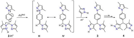 The synergy of both steric and electronic effects is evident in the reaction of the unsubstituted pyrazole (Pz) and PhCCl3 that produce the stabile compound 1b as the only product. No decomposition or transformation of 1b was observed at the temperature of 120 °C. Pyrazole is non-steric constrained and less basic than PzMe2 (pKa values are 2.85 and 14.2 for Pz, 4.28 and 15.1 for PzMe2) [40,41]. Compounds 3 and 4 are produced from compound 2. Their formation implies the substitution of N-bonded PzMe2 by C-bonded PzMe2. At 120 °C, compound 2 irreversibly releases one protonated pyrazole ring. This step requires the participation of an electron donating group in the aryl ring to weaken the C-N bond via the formation of the quinonoid carbocation intermediate III, which is stabilized by resonance. The intermediate resonance hybrid form IV performs an aromatic electrophilic substitution (AES) on the 4-position of PzMe2 to form compound 3. The subsequent elimination-substitution of the second pyrazole leads to the formation of compound 4 (Scheme 4). The activating role of the electron donating group in the aryl ring have been demonstrated to be necessary in an elimination-addition mechanism that provides access to tris(pyrazolyl)-toluidines [25]. On the other hand, AES reaction in PzMe2 is reported to occur under mild conditions [42].