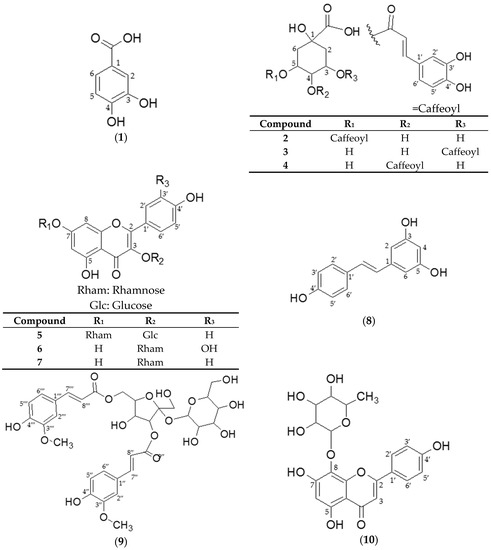 Samples of SCS for isolation were obtained from Yesan-gun, Chungcheongnam-do, Korea. Six samples of SCS for content analysis were collected from forests throughout different regions of Korea in August and botanically identified for content analysis. The stems were stored at 4 °C prior to extraction. Ten compounds: protocatechuic acid (1), 5-O-caffeoylquinic acid (2), 3-O-caffeoylquinic acid (3), 4-O-caffeoylquinic acid (4), kaempferol 3-O-β-d-glucopyranosyl-7-O-α-l-rhamnopyranoside (5), quercitrin (6), afzelin (7), trans-resveratrol (8), helonioside A (9), isoscutellarein 8-O-rhamnoside (10) were isolated as described in Section 3.3.