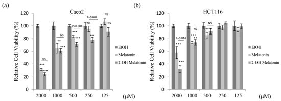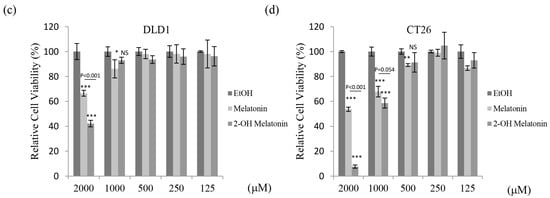 Cytotoxic effects of 2-hydroxymelatonin on human colorectal cancer cells. (a–d) Percentage viability of Caco2 (a), HCT116 (b), DLD1 (c), and CT26 (d) cells treated with melatonin or 2-hydroxymelatonin. Cells were treated with 125–2000 µM melatonin or 2-hydroxymelatonin dissolved in ethanol for 48 h, and cell viability was measured by the MTT assay. Data represent means ± standard error of the mean, n = 3. * p < 0.05; ** p < 0.01; *** p < 0.001; NS, no significant difference compared with the ethanol-treated group. EtOH, ethanol; 2-OH Melatonin, 2-hydroxymelatonin.