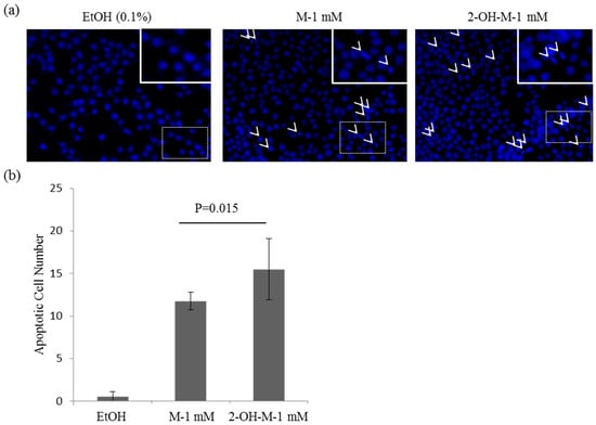 Induction of nuclear condensation in Caco2 cells by melatonin or 2-hydroxymelatonin. (a) Hoechst 33258 staining of Caco2 cells treated with melatonin or 2-hydroxymelatonin dissolved in ethanol. Arrows indicate cells with condensed or fragmented nuclei. Representative images from three independent experiments are shown. Enlarged images are shown in the top right inset of the image; (b) Quantification of condensed or fragmented nuclei in cells treated with melatonin or 2-hydroxymelatonin. Data represent mean ± standard error of the mean, n = 3. EtOH, ethanol; M, melatonin; 2-OH-M, 2-hydroxymelatonin.
