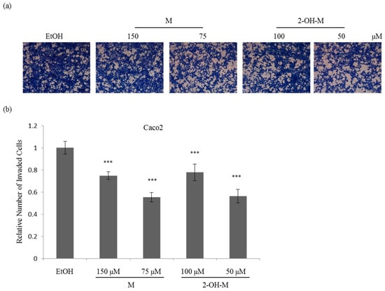 Inhibition of the invasive ability of Caco2 cells by treatment with sub-lethal concentrations of melatonin or 2-hydroxymelatonin. (a–b) Invasion assay of Caco2 cells treated with melatonin or 2-hydroxymelatonin dissolved in ethanol (a), and quantification of the number of invaded cells in each group (b). Representative images from three independent experiments are shown. Data represent mean ± standard error of the mean, n = 3. *** p < 0.001 compared with the ethanol-treated group. EtOH, ethanol; M, melatonin; 2-OH-M, 2-hydroxymelatonin.
