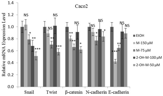 mRNA expression of Epithelial–mesenchymal transition (EMT) markers upon treatment with sub-lethal concentrations of melatonin or 2-hydroxymelatonin. Quantitative analysis of the mRNA levels of EMT markers in Caco2 cells treated with melatonin or 2-hydroxymelatonin dissolved in ethanol for 24 h. Data represent mean ± standard error of the mean, n = 3. * p < 0.05; ** p < 0.01; *** p < 0.001; NS, no significant difference compared with the ethanol-treated group. EtOH, ethanol; M, melatonin; 2-OH-M, 2-hydroxymelatonin.