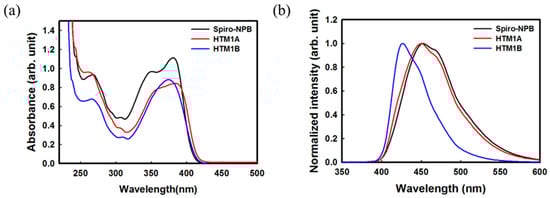 UV-visible absorption (a) and PL spectra (b) of HTMs 1A, 1B and Spiro-NPB.