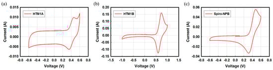 Highest occupied molecular orbital (HOMO) energy values were elucidated from cyclic voltammetry (CV) measurements and are shown in Figure 2 and summarized in Table 1. The calculated HOMO levels of HTM 1A and 1B were −5.33 and −5.54 eV, with HTM 1A showing a slightly higher HOMO energy level than HTM 1A which can further facilitate its effective hole transport properties.