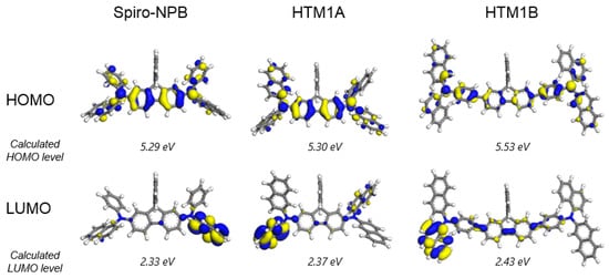 Calculated DFT frontier molecular orbitals of Spiro-NPB, HTM 1A and HTM 1B.