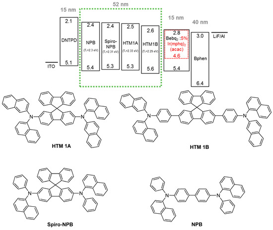 Initially spirobifluorene-based molecules were introduced as host materials and blue fluorescent emitters in several organic electronics devices to ensure the effective energy flow from the host to the guest system. The spirobifluorene core can provide certain characteristics like higher triplet energy, elevated glass transition temperature, stable decomposition temperature and matching of frontier molecular orbital (FMO) energy values with adjacent layers. The higher triplet energy of spirobifluorene caused by conjugation disconnection through its sp3 carbon and twisted non-coplanar structure can prevent the intermolecular interaction to support the stable film formation during the device fabrication process [23,24,25]. At the same time, the spirobifluorene core can offer the possibility of modification at the 2nd and 7th positions to obtain higher chemical reactivity [7,26]. The most commonly known spirobifluorene based HTM is N2,N7-di(naphthalen-1-yl)-N2,N7-diphenyl-9,9′-spirobi[fluorene]-2,7-diamine (Spiro-NPB) [27,28]. In this work, we have modified the spirobifluorene structure to produce an effective hole transporting material by attaching electron-rich nitrogen-based amine derivatives A and B, which increases the conjugation length of the molecules, which can reduce the energy level and ensure higher quantum efficiencies. The synthesized derivatives, named HTM 1A and HTM 1B, were applied on a red phosphorescence-based OLED device and we compared the device properties with the references Spiro-NPB and NPB. Here we adopt Spiro-NPB for our reference due to the similarity of its core structure with our designed materials. HTM 1B showed better device performances than reference materials and improved external quantum efficiencies up to 13.64%.