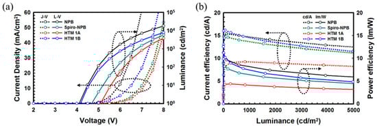 For further investigation of the performance of our designed materials, we have fabricated device 1 based on NPB and device II based on spiro-NPB as hole-transporting materials for our current studies. HTM 1B-based device IV and NPB-based device I showed similar turn on voltages of 4.0 V, which was lower than that of the spiro-NPB based device II (4.5 V) and which can boost the device efficiency. The current density-voltage-luminescence (J-V-L) characteristics and current efficiency spectra are shown in Figure 5 and summarized in Table 2.