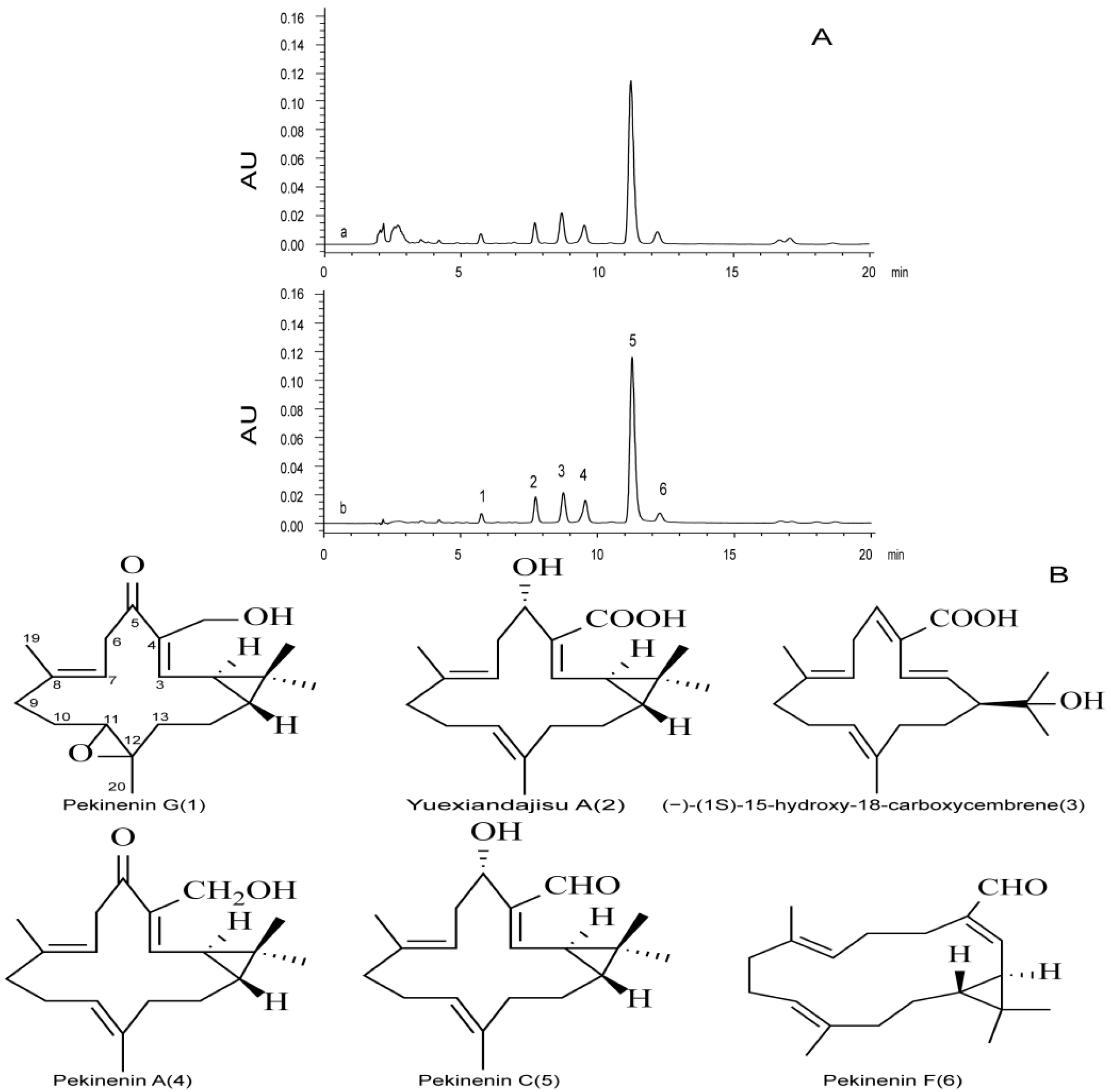 - Shao, F.; Bu, R.; Zhang, C.; Chen, C.; Huang, J.; Wang, J. Two new casbane diterpenoids from the roots of Euphorbia pekinensis. J. Asian Nat. Prod. Res. 2011, 13, 805–810. [Google Scholar] [CrossRef] [PubMed]
