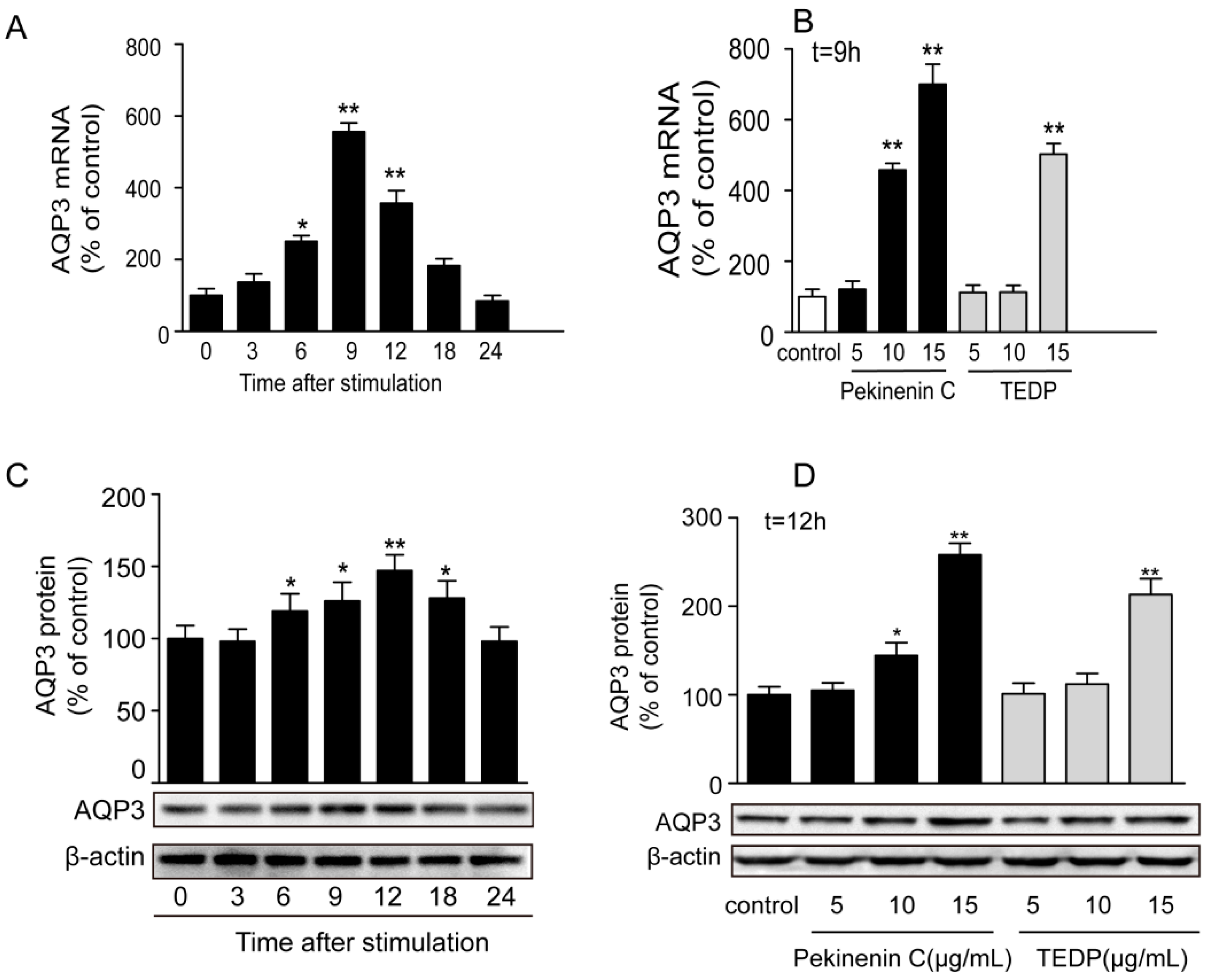 2.5. Pekinenin Cand TDEP Increased Gene and Protein Expressions of AQP3 in HT-29 Cells