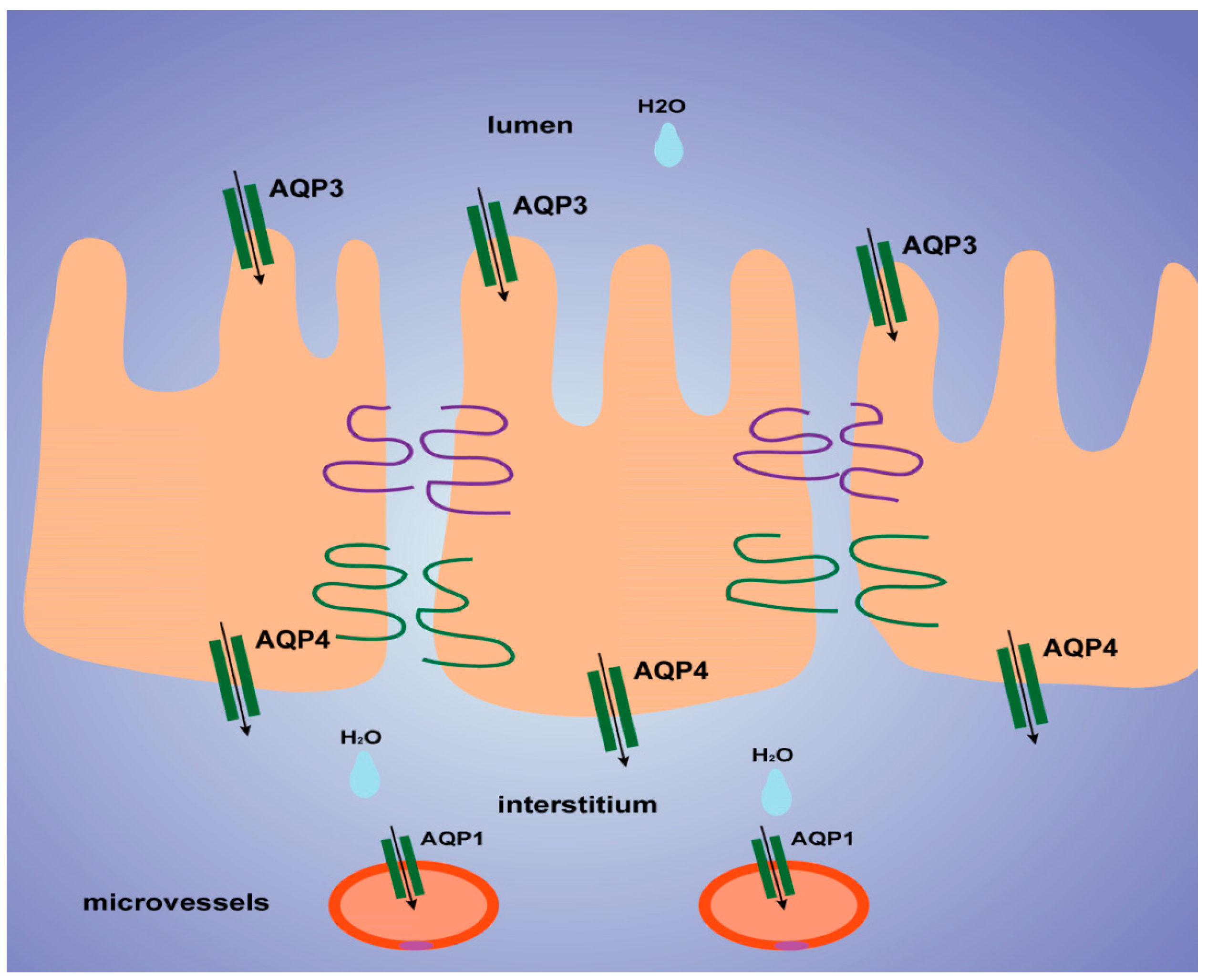 - Pelagalli, A.; Squillacioti, C.; Mirabella, N.; Meli, R. Aquaporins in Health and Disease: An Overview Focusing on the Gut of Different Species. Int. J. Mol. Sci. 2016, 17, 1213. [Google Scholar] [CrossRef] [PubMed]