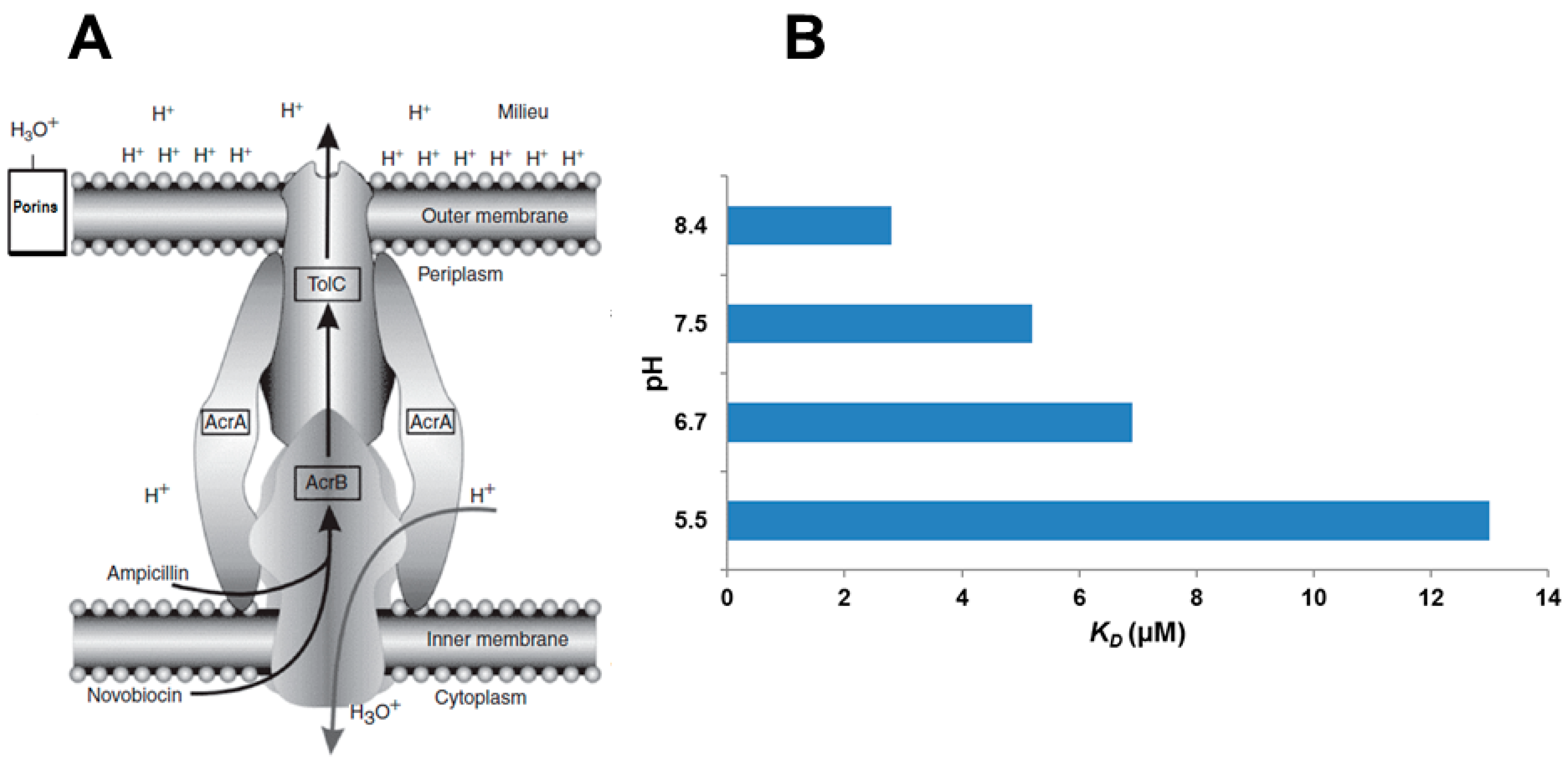 Simplified structure of the AcrAB-TolC pump of a Gram-negative bacterium and proposed mechanism of action ((A): adapted from [101], (B): adapted from [160]). (A) The AcrAB–TolC efflux pump consists of two fusion proteins AcrA (made of six monomers) that anchors the AcrB transporter (made up of three monomers) to the plasma membrane. The latter is connected to the TolC channel (which consist of three monomers, therefore the stoichiometry of the respective pump proteins AcrA–AcrB–TolC is 3:6:3. providing a conduit to the exterior of the bacterium [161]. Noxious agents may enter the transporter from the periplasm or the cytoplasm [128]. The key enzyme is ATP synthase situated within the plasma membrane with one active site for ATP in the periplasm and one active site on the cytoplasmic side of the plasma membrane [162,163]. At pH 7 equilibrium favors the hydrolysis of ATP. At pH 6 equilibrium favors the synthesis of ATP. In order for the pump to work at pH 7, metabolic energy from glycolysis is required [164] for the creation of ATP which is hydrolyzed by the ATP synthase. The product hydronium ion (H3O)+ present in water enters the AcrAB transporter which had recognized the noxious agent and bound it; this reduces the pH of internal part of the transporter thereby encouraging the dissociation of the agent (B) [165] which is then pushed out into the TolC channel by the movement of water and expelled to the milieu. Because the hydronium ions are attracted to components of the outer membrane (lysine, arginine, lipopolysaccharides), they contribute to the proton motive force (PMF) [166]. The AcrAB–TolC pump is now ready to recognize a noxious agent. When the bacterium is in medium of pH 5.5 there is no need for metabolic energy [158]. At this pH the concentration of hydronium ions is high and some are bound to the outer membrane resulting in a strong electrochemical gradient (PMF) that favours their movement into the periplasm via porins [167]. It should be noted that when the AcrAB efflux pump is over-expressed, the major porin C is down-regulated resulting in fewer porins [156]. This provides additional protection from noxious agents.