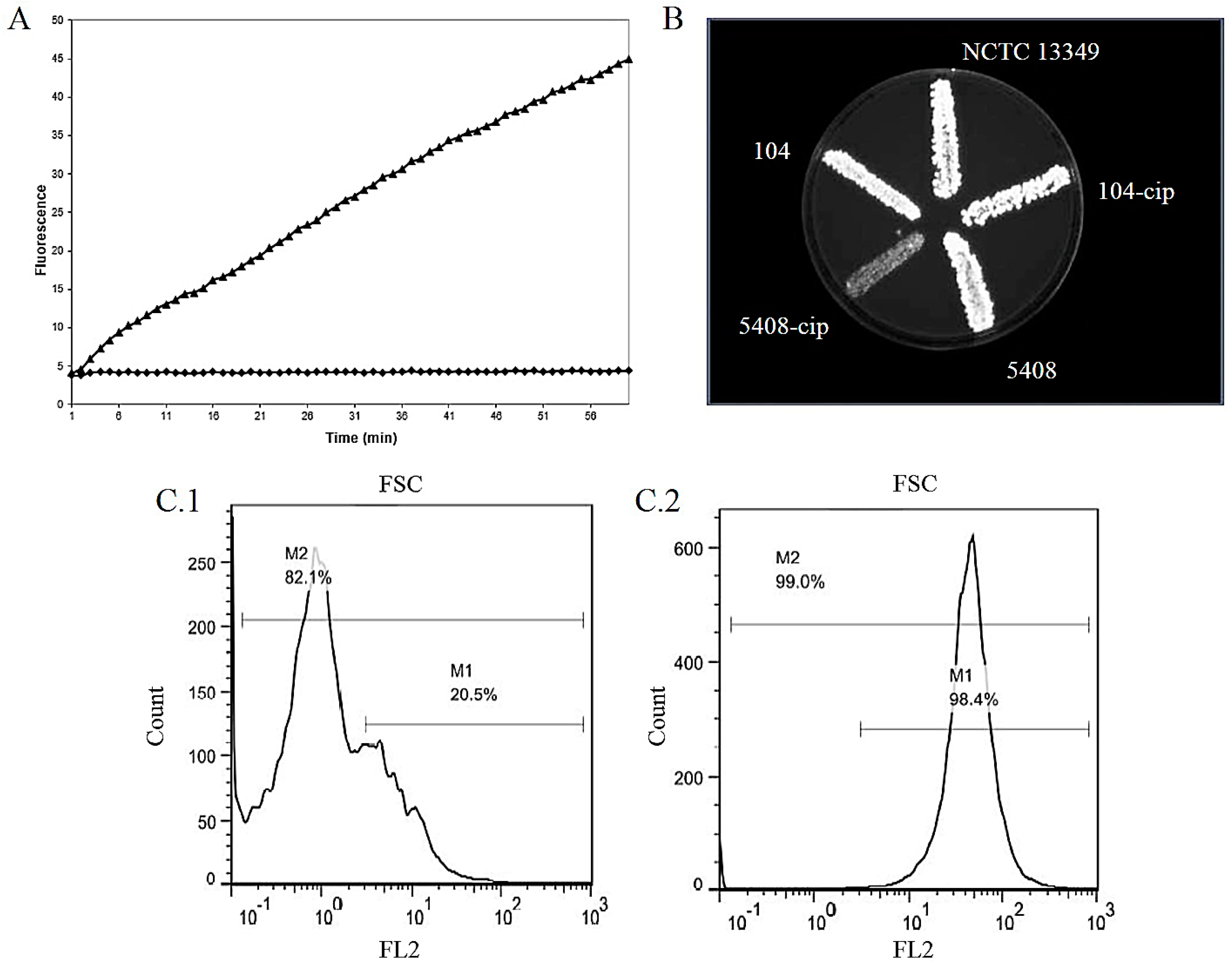 Accumulation methods to measure the activity of bacterial efflux pumps. (A) Accumulation of EB by Salmonella enterica serovar Enteritidis 104 at pH 5 in the presence of thioridazine (50 µg/mL) using real-time EB method. The flat curve represents the accumulation of the untreated strain [226]; (B) Cartwheel method to monitor efflux activity of control (NCTC 13349), clinical (104, 5408), and ciprofloxacin resistant (104-cip, 5408-cip) Salmonella enterica serovar Enteritidis strains using EB containing (2.5 mg/L) tryptic soy agar plate [177]; (C.1) Accumulation of EB (1 µg/mL) by E. coli AG 100 strain using flow cytometry [158]; (C.2) Accumulation of EB (1 µg/mL) by E. coli AG 100 strain in the presence of thioridazine (20 µg/mL) using flow cytometry [169].
