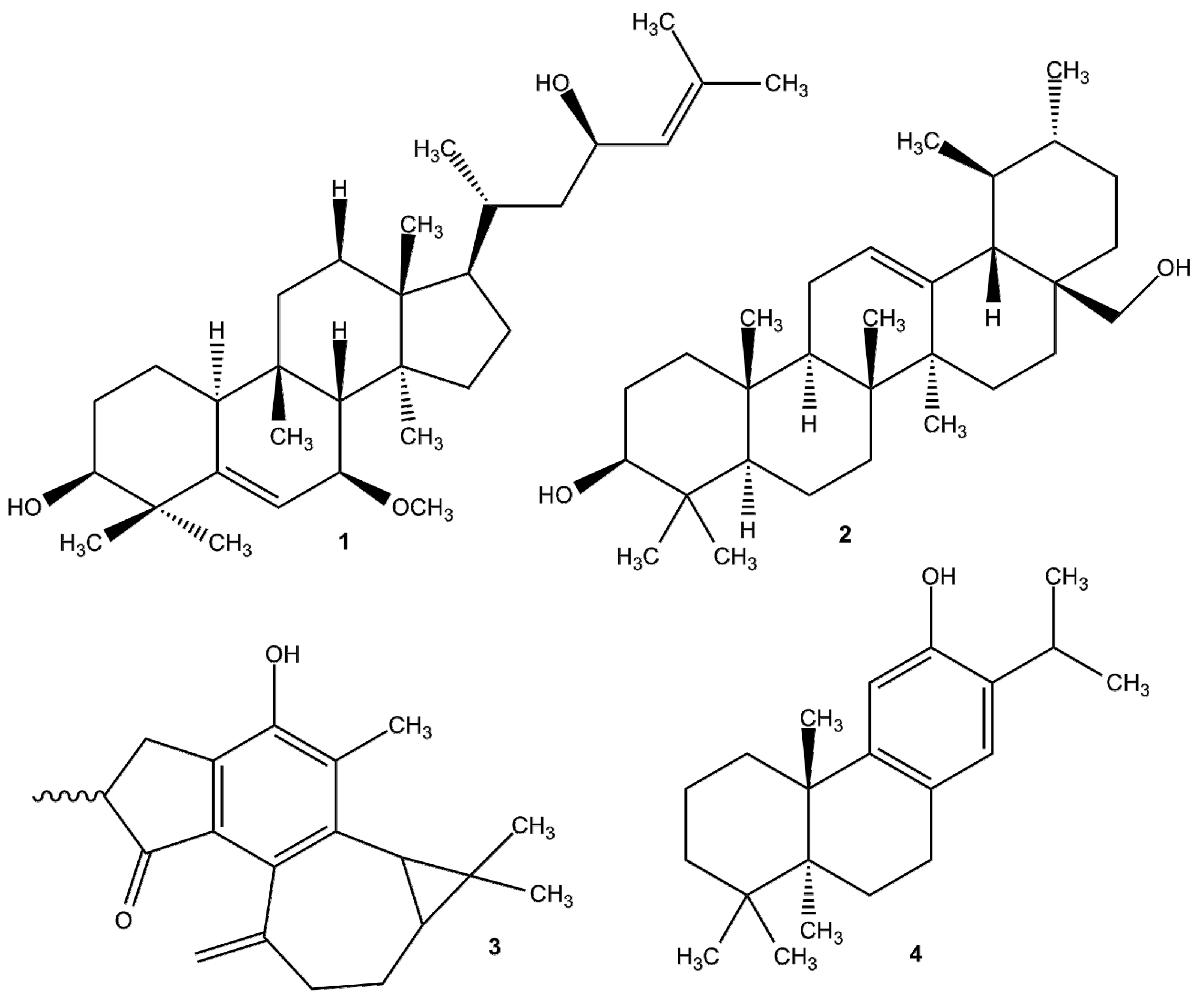 Examples for natural EPI compounds. (1) Karavilagenin C; (2) uvaol; (3) jatropholone A and B; (4) ferruginol.
