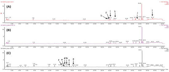 Base peak ion count chromatogram for the three components of red ginseng: (A): main roots; (B): lateral roots; (C): fine roots.