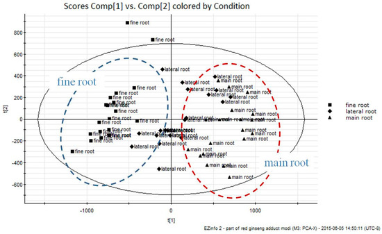 Principal component analysis (PCA) score plot for main roots and fine roots.