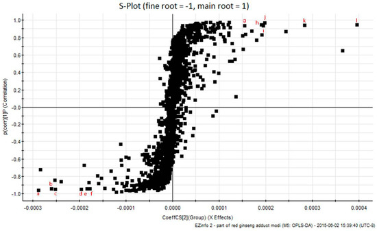 To find novel marker substances, unsupervised PCA and supervised OPLS-DA were performed using the non-targeted analysis data of UPLC-QToF MS (Figures S13 and S14). After creating a process for mean-centering and Pareto scaling, data were displayed as PCA score plots (Figure 2). As shown, each part of the RG specimens were very clearly clustered into three groups, namely, main roots, lateral roots, and fine roots. Thus, to explore the potential markers that contributed most to the observed differences between the different parts of RG, UPLC-QToF MS data from the main root and fine root groups were processed via supervised OPLS-DA.