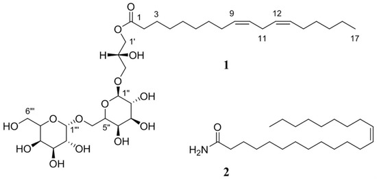 Compound 1 was isolated as a white powder with the molecular formula C33H58O14, which was deduced from HRFABMS. The observation of a carbonyl carbon at δC 175.5 in the 13C-NMR spectra and an absorption band at 1760 cm−1 in the IR spectrum were indicative of an ester linkage. The NMR data displayed signals of 15 oxygenated carbons at δC 74.7~62.7 and their attached protons at δH 4.3~3.5. 1H COSY, gHSQC, and gHMBC correlations among these signals revealed the presence of a glycerol-type moiety and two sugars (Figures S15 and S16). The remaining portion of the molecule, containing the ester and all of the upfield carbons and protons, was found to form a long chain by 1H COSY analysis and was connected to the C-1 of glycerol, based on long-range correlations between the ester carbon and H-1 methylene protons in the gHMBC data. The linear nature of this compound was evident from the presence of several signals in the regions of δC 30.8~30.2 and δC 1.36~1.28 in the 13C- and 1H-NMR data, respectively. The fatty acid chain of 1 possessed two conjugated cis-double bonds, and these assignments were made based upon an analysis of the vicinal coupling constants of 10.3 and 10.5 Hz. The double bonds were placed at C-9~C-10 and C-12~C-13 by conspicuous ion clusters in FAB collision-induced dissociation (FAB-CID) MS/MS data (Figure S5). The gross structure of Compound 1 was defined as a glyceroglycolipid. Treatment of 1 with sodium methoxide in methanol furnished a glycerol digalactoside, which was identified by comparison of specific rotation (1: 78.2 (c 0.1, H2O); (2’R)-glyceryl 6-O-(α-d-galactopyranosyl)-β-d-galactopyranoside: 80.0 (H2O) and 13C-NMR [11,14]. Spectral data for the compound was consistent with previous report for the gingerglycolipid B [11]. Compound 2 was identified in our previous study as 13-cis-docosenamide [12].