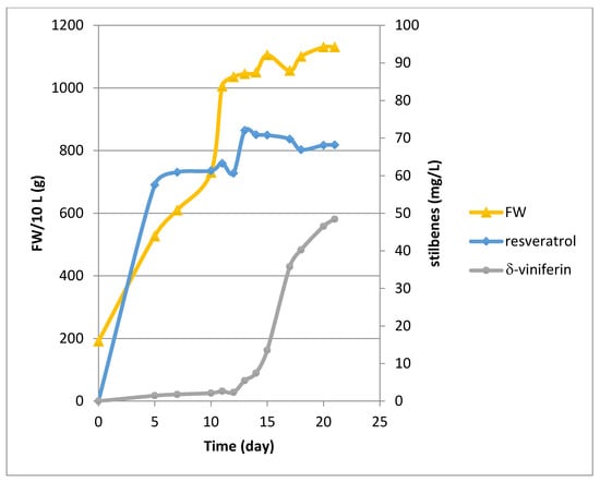 Bioreactor culture experiments were conducted over a period of 21 days in the presence of β-cyclodextrins (CDR). Methyl jasmonate (MeJA) was only added at Day 11 of the culture. Both cyclodextrins and MeJA are known to be elicitors of stilbene production in grapevine cell suspensions [19,20,21,22,23]. Cell growth showed an exponential phase (Figure 1) followed by a stationary phase upon addition of MeJA. The growth rate, determined between Day 0 and Day 11, gave a μ value of 0.15 day−1 corresponding to a Td of 4.59 days. As currently observed with our Concord cell line, no resveratrol production occurred without elicitation (Day 0). In presence of the CDR alone, resveratrol reached about 60 mg/L during the exponential phase followed by a peak at 72 mg/L at Day 13, two days after the addition of MeJA. Then its level remained almost constant until the end of the culture with a value of 68.1 mg/L (Figure 1). The production of δ-viniferin was quite low in presence of the CDR alone, its biosynthesis being activated after MeJA addition, with a production of 48.4 mg/L at Day 21 (Figure 1). Only resveratrol and δ-viniferin were quantified by UPLC, but several other peaks occurred on the chromatograms corresponding to resveratrol derivatives, the biosynthesis of which was only activated upon addition of MeJA.