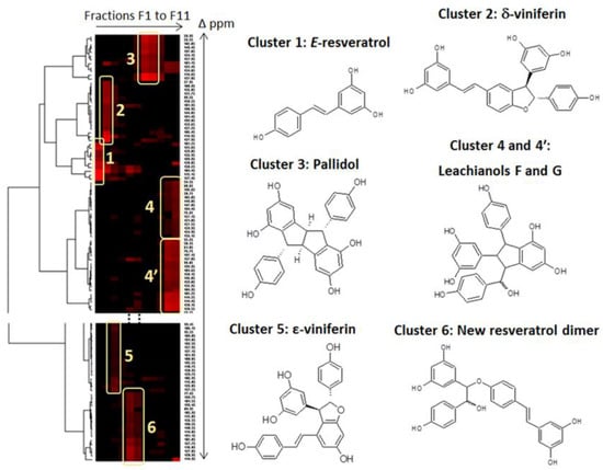 In the HCA correlation map presented in Figure 2, several well-defined clusters were intensely colored in red. Cluster 1 corresponded to an intense cluster of ten 13C-NMR chemical shifts. After entering these chemical shifts into a database containing 13C-NMR data of natural compounds, including 101 known stilbene structures from different plant genera, the structure of trans-resveratrol (1) was proposed as the first hit out of 60 proposals. This structure was confirmed by checking all the chemical shifts of trans-resveratrol in NMR spectra of fractions F1 in which the intensity of cluster 1 was predominant. By using the same method, clusters 2, 3, and 5 were identified as δ-viniferin or maximol A (2), pallidol (3), and ε-viniferin (5). Clusters 4 and 4′ corresponded to leachianol F (4) and leachianol G (4′), respectively, which were both present as a diastereoisomer mixture in fractions F10 and F11. Cluster 6 did not match with any known stilbene molecular structure stored in our database. Further 2D NMR analyses including HSQC, HMBC, and COSY were performed on fractions F5 and F6 containing the signals of cluster 6, leading to the identification of a new resveratrol dimer (6) which has never been described previously. To our knowledge, only one report has described the chemical synthesis of a methoxy-substituted derivative of this compound together with a series of other hydroxystilbene analogs in order to investigate the catalytic action of a laccase from Trametes pubescens on the dimerization of hydroxystilbenes [26].