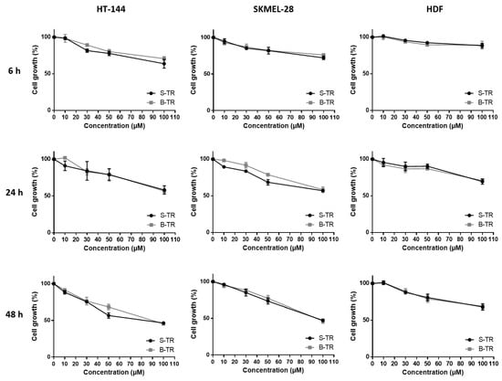 Cell viability inhibition of two different sources of trans-resveratrol. HT-144, SKMEL-28 and HDF cells were treated with various concentrations (10–100 μM) of synthetic trans-resveratrol (S-TR) and bio-produced trans-resveratrol (B-TR) for 6, 24 and 48 h. Cell viability was determined by the MTT assay. The final volume of ethanol was 0.01% and 0.1% for 10 and 100 μM concentrations, respectively. Data are expressed as the means ± SD of 3 independent experiments. Each experiment was performed in triplicate