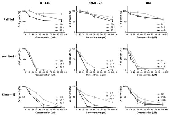 Cell viability inhibition of bio-produced resveratrol oligomers. HT-144, SKMEL-28 and HDF cells were treated with various concentrations (10–100 μM) of pallidol, ε-viniferin and dimer (6), three bio-produced reveratrol oligomers, for 6, 24 and 48 h. Cell viability was determined by the MTT assay. The final volume of ethanol was 0.01% and 0.1% for 10 and 100 μM concentrations, respectively. Data are expressed as the means ± SD of 3 independent experiments. Each experiment was performed in triplicate.