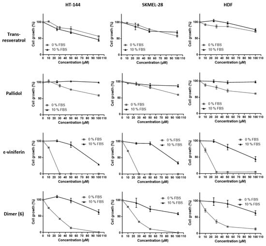 Cell viability inhibition of bio-produced stilbenes (resveratrol and the three dimers) with or without FBS. HT-144, SKMEL-28 and HDF cells were treated with various concentrations (10–100 μM) of bio-produced stilbenes for 24 h with FBS (10% FBS) or not (0% FBS). Cell viability was determined by the MTT assay. The final volume of ethanol was 0.01% and 0.1% for 10 and 100 μM concentrations, respectively. Data are expressed as the means ± SD of 3 independent experiments. Each experiment was performed in triplicate.