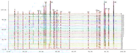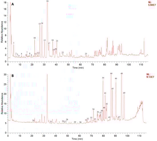 A total of 49 compounds, including 26 phenolic acids and 23 diterpenoid quinones, were deduced and identified (Table 2). Eight of the identified compounds were authenticated by comparison with reference standards including DSS, PAL, RA, SAB, DI, CT, DI, and IIA. The others were tentatively judged by interpreting their mass spectral behavior and comparing them with related literature data [36,37,38,39,40,41,42,43,44]. The total ion current (TIC) chromatograms are shown in Figure 2.