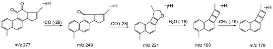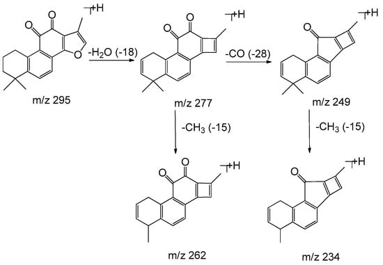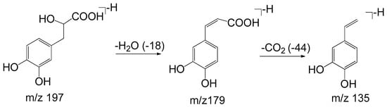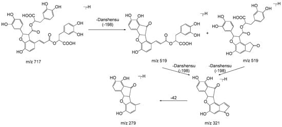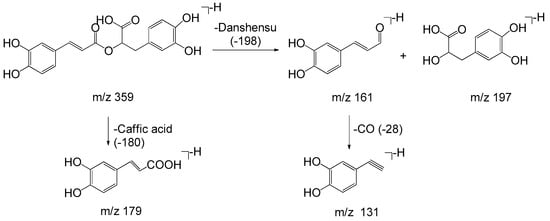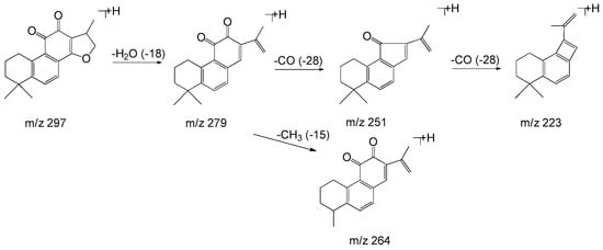 Monomers of phenolic acids include DSS, caffeic acid, protocatechuic acid, and PAL which have only phenyl group. The [M − H]⁻ ion at m/z 197 of DSS produced [M − H − H2O]⁻ (m/z 179) and [M − H − H2O − CO2]⁻ (m/z 135) due to the existence of hydroxyl and carboxyl group, and the [M − H]⁻ ion at m/z 137 of PAL produced the fragment of [M − H − CO]⁻ (m/z 109). As for dimers, trimers, and tetramers such as RA and SAB, their spectra exhibited [M − H − 198]⁻, [M − H − 198 − 180]⁻, and [M − H − 198 − 198]⁻ ions corresponding to the loss of DSS (198 Da) and caffeic acid (180 Da), respectively. The fragment ions of tanshinones are mainly involved in the loss of a molecule of H2O [M + H − 18]+ due to enolic rearrangement of a ketonic group. Further loss of CO from these fragment ions gave rise to [M + H − 28]+. Besides, the prominent ions of [M + H − 18 − 15]+ or [M + H − 28 − 15]+ were further formed by loss of a methyl group. The proposed fragmentation pathways of the typical phenolic acids and tanshinones are illustrated in Figure 3, Figure 4, Figure 5, Figure 6, Figure 7, Figure 8 and Figure 9.