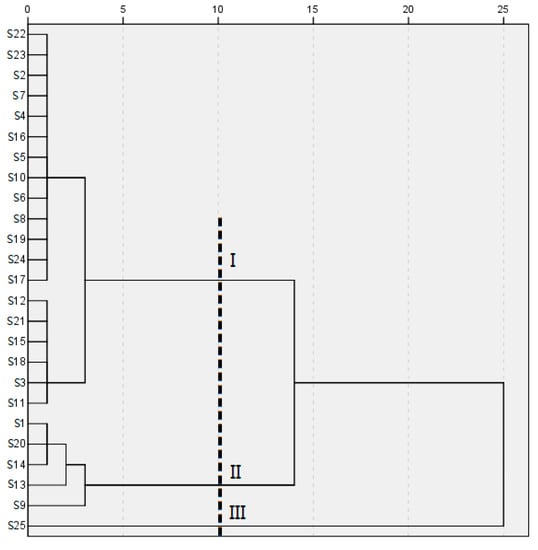 In order to evaluate resemblance and dissimilarities of Danshen samples based on the fingerprint data, HCA was performed which could divide tested samples into different categories. Individuals within the same category should have the highest possible homogeneity and the highest possible heterogeneity should exist between different categories. Figure 10 displays the dendrogram which was generated with PAs of the 21 common components from 25 fingerprints and formed a 21 × 25 matrix. These samples were sorted into three clusters, reflecting the difference in quality of Danshen samples from the viewpoint of active ingredient contents. With the purpose of investigating the reasons for sample classification, we had studied the grouped samples one by one in every detail from its marks (the collection date, cultivation methods, geographic origins, and processing methods) to total PA of common peaks in each fingerprint which could reveal the total content of active constituents. From the dendrogram, samples were mixed together and not grouped strictly on the basis of their origins. Yet samples processed by sweating or sun curing were grouped into the same class (cluster I) and most of the samples dried in the shade were in cluster II except S15 and S19. The sample dried in the oven belonged to cluster III. It was suspected that sample classification might be relevant to processing method rather than the origin. Then all samples were treated by different processing methods respectively, including sun curing, shade drying, oven drying, and sweating, to explore the impact on metabolites caused by geographical origins and processing methods. The results showed that the samples processed by the same method were similar on fingerprints and total PA of common peaks and we could rule out the influence of origin on sample quality. However, there were significant differences between samples which were from the same location but treated by different processing methods, it indicated the processing method could affect the internal chemical profile. In addition, the total content of common ingredients was the highest in cluster II, followed in decreasing orders by cluster III and cluster I. Therefore, we could come to the conclusion that the processing method had a more obvious impact on sample classification than the geographical origin, it induced the different content of bioactive compounds and finally lead to different qualities. Next, the other chemometric analysis was taken into consideration to measure the degree of the similarity among the samples in the same cluster, and pick a few key chemical markers for explaining sample variation.