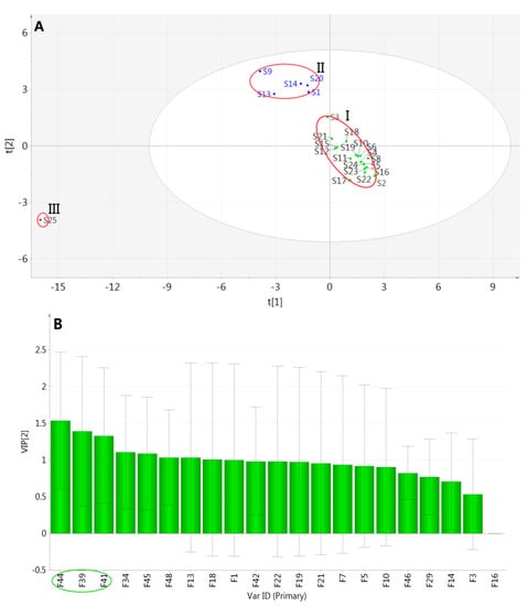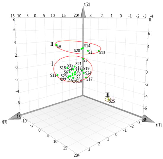 The fingerprints are usually wide data matrices, characterized by a very large number of variables. PCA is a simple non-parametric method widely used for sample categorization further by data compression and information extraction [45]. It could fit a small number of underlying factors called principal components (PCs) which were unique, mutually exclusive, and accounted for as much of the variable information as possible [28,46]. In accordance with Eigenvalue >1, the first three PCs were extracted and explained 71.0, 18.0, and 5.29% of the total variability, respectively. All three PCs could accumulate about 94.3% data variance, and the roles of other PCs were insignificant. The 3D score plot of the first three PCs is showed in Figure 11, where each axis represents a PC and all samples could be separated into three groups. S25 was outside the scope of Hotelling’s T2 ellipse, which meant notable differences with others due to the different processing methods. The dissimilarities of Danshen samples were observed intuitively, indicating that the contents of common ingredients were different in spite of similar chemotypes. Moreover, the samples in cluster I were scattered in a larger region compared with those of cluster II and III. It demonstrated that the products of cluster I had a larger quality fluctuation than those by other processing methods. In our study, the PCA classification results were consistent with HCA results and this method provided a more reliable evidence for the discrimination of Danshen. However, it was still not clear which major compounds caused the classification of these samples. Therefore, a PLS-DA technique development is necessary to find out definite indexes of describing the differences.