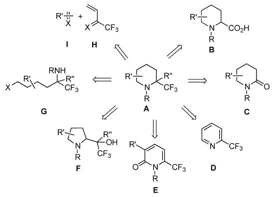 Herein, we report the synthesis of α-trifluoromethylpiperidinic derivatives of type A. These compounds have been synthesized either from 6-membered rings B and C by introduction of a CF3 group, from pyridines D or pyridinones E by reduction, from 5-membered rings F by ring expansion, from linear amines G by cyclization, from dienes/dienophiles H/I by cycloaddition (Scheme 1). We will only report the formation of monocyclic piperidinic derivatives, and of bicyclic derivatives only when they were transformed into the monocyclic derivatives.