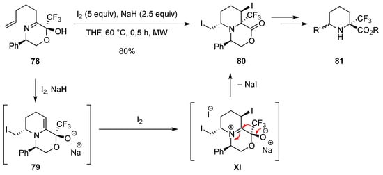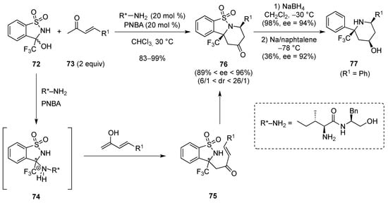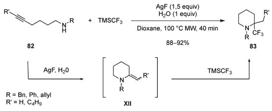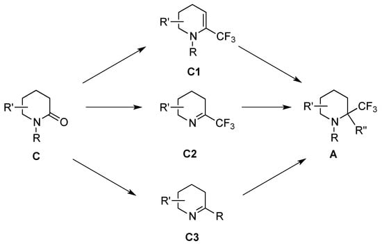 In imines 13, the CF3 group is initially located in the α-position and then different R substituents can also be introduced in the α-position. From an imine intermediate, the reverse strategy can be used to access compound A, e.g., imines are synthesized from a δ-lactam and then the trifluoromethyl group is introduced. Thus, when imines 27, prepared from the corresponding δ-lactams, were treated with the Ruppert-Prakash reagent (TMSCF3) in the presence of TFA and KHF2, in MeCN, the α,α-disubstituted piperidines 28 were isolated in good yields. The activation of imines 27 under acidic conditions was necessary to obtained piperidines 28 (Scheme 13) [].