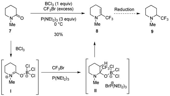 α-Trifluoromethyl cyclic enamines C1 can be good precursors of A as they are easily obtained from δ-lactams. When lactam 7 was treated with trichloroborane in the presence of an excess of CF3Br and HEPT, enamine 8 was formed in 30% yield via the formation of iminium species I which can be attacked by the CF3– anion, generated from CF3Br. Intermediate II was thus produced and after a β-elimination, enamine 8 was formed (Scheme 6) []. A reduction of this enamine should lead to 2-trifluoromethylpiperidine 9. It is worth noting that CF3Br is not easy to handle as it is a gas and alternatives to synthesize 2-trifluoromethylpiperidines from δ-lactams from imines C2 and C3 have been devised.