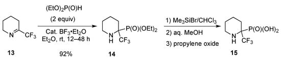 When 13 was treated with diethyl phosphite in the presence of boron trifluoride etherate (BF3.OEt2) as the catalyst, 2-(trifluoromethyl)-2-ethylphosphonate piperidine (14) was obtained (92%) and easily transformed to the corresponding α-trifluoromethyl substituted cyclic α-aminophosphonic acid 15 by treatment with trimethylbromosilane in CHCl3 followed by the addition of aqueous MeOH. It is worth pointing out that to avoid the formation of the ammonium salt, due to the liberation of HBr during the hydrolysis of the ester, the addition of propylene oxide was necessary and the free amino acid 15 was isolated (Scheme 9) [].
