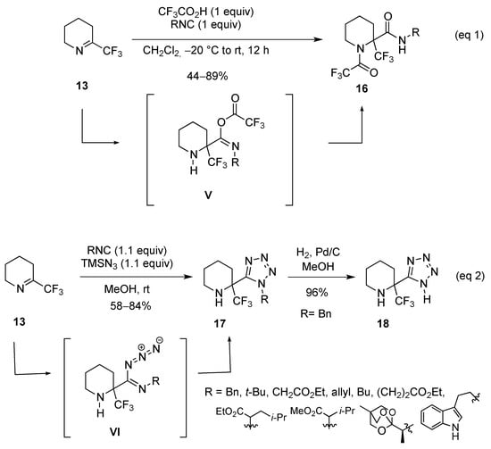 Imine 13 was transformed to the piperidinic derivatives 16 when subjected to an Ugi-type reaction using isocyanides. Thus, when 13 was treated with an isocyanide (RNC) in the presence of CF3CO2H, piperidine 16 was formed via intermediate V (Scheme 10, eq. 1) []. It is worth mentioning that an azido-Ugi reaction was performed using isocyanate (RNC) in the presence of TMSN3 in MeOH. Under these conditions, tetrazole 17 was obtained via intermediate VI. In addition, when benzylisocyanate (BnNC) was used, the corresponding piperidyltetrazole (17, R = Bn) was isolated and debenzylated by hydrogenolysis (H2, Pd/C, MeOH) to produce 18 in good yield (96%) (Scheme 10, eq. 2) [].