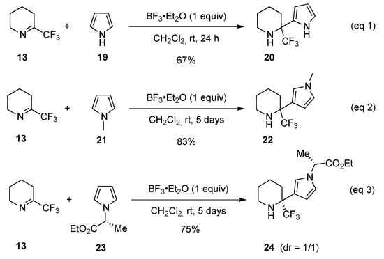 If tetrazole can be introduced at the α-position of α-trifluoromethylpiperidyl derivatives, using an Ugi-type reaction, other heterocycles such as pyrroles, indoles can also be introduced in the α-position by using a Friedel-Craft reaction. When imine 13 was treated with the non-protected pyrrole 19 in the presence of BF3.OEt2, the unexpected piperidine 20, possessing a C2-substituted pyrrole was obtained (67%) (Scheme 11, eq. 1). On the contrary, when the N-methylpyrrole 21 was involved in the Friedel-Craft reaction, piperidine 22, substituted in the α-position by the C3-substituted pyrrole, was isolated (Scheme 11, eq. 2). The same regioselectivity at C3 was observed with pyrrole 23. It is worth mentioning that no diastereoselectivity was observed with pyrrole 23 as a ratio of 1 to 1 was observed for 24 (Scheme 11, eq. 3). As noticed, the reaction with non-protected and protected pyrroles is very regioselective. This regioselectivity can be the result of steric interactions between the N-substituent of the pyrrole and the cyclic imine which can be quite significant due to the bulkiness of the trifluoromethyl group and its specific nature and, the C3 isomers were formed. When less steric interactions were present, e.g., with unprotected pyrroles, the C2-isomers were formed (Scheme 11, eq. 1) [,].